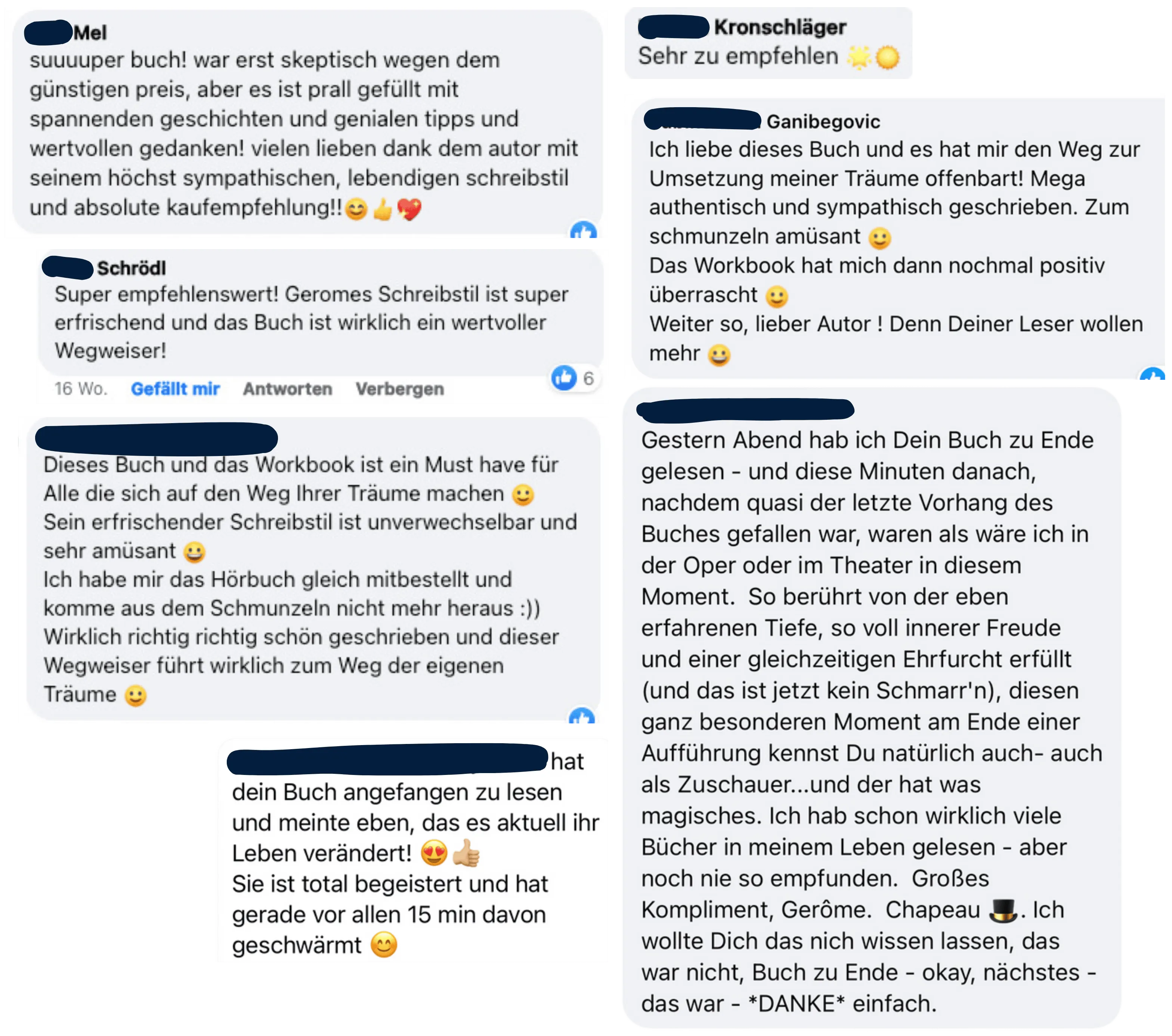 «Ich bin mit Glück erfüllt. Es liest sich wie eine warme Schokolade auf einer Terrasse im Schaukelstuhl mit ganz viel Weitsicht. Durch seine Tools und Ermutigung wurde ich mit meinem Film kurze Zeit später auf vier Kontinenten nominiert und stand in Hollywood auf dem roten Teppich.»
